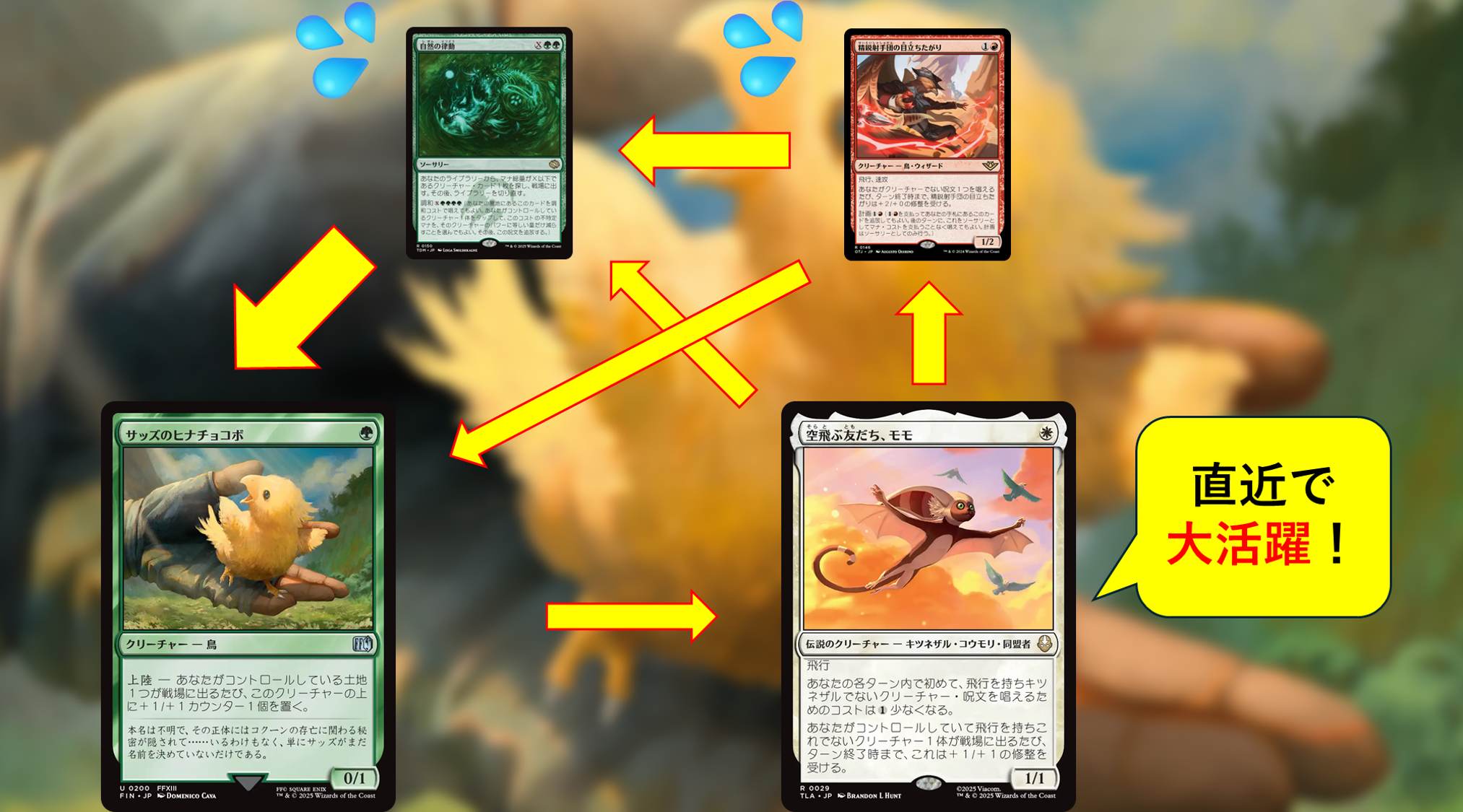 《サッズのヒナチョコボ》や《土のベンダーの位に至る》の上陸を、《寓話の小道》や《氷耕しの探検家》によって複数回誘発させることで速やかに脅威として育て上げます。