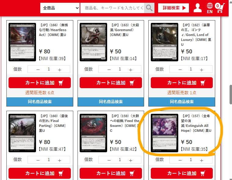 たとえば、『統率者マスターズ』でアンコモンとして収録されて使えるようになった《全希望の消滅》を検索してみましょう。